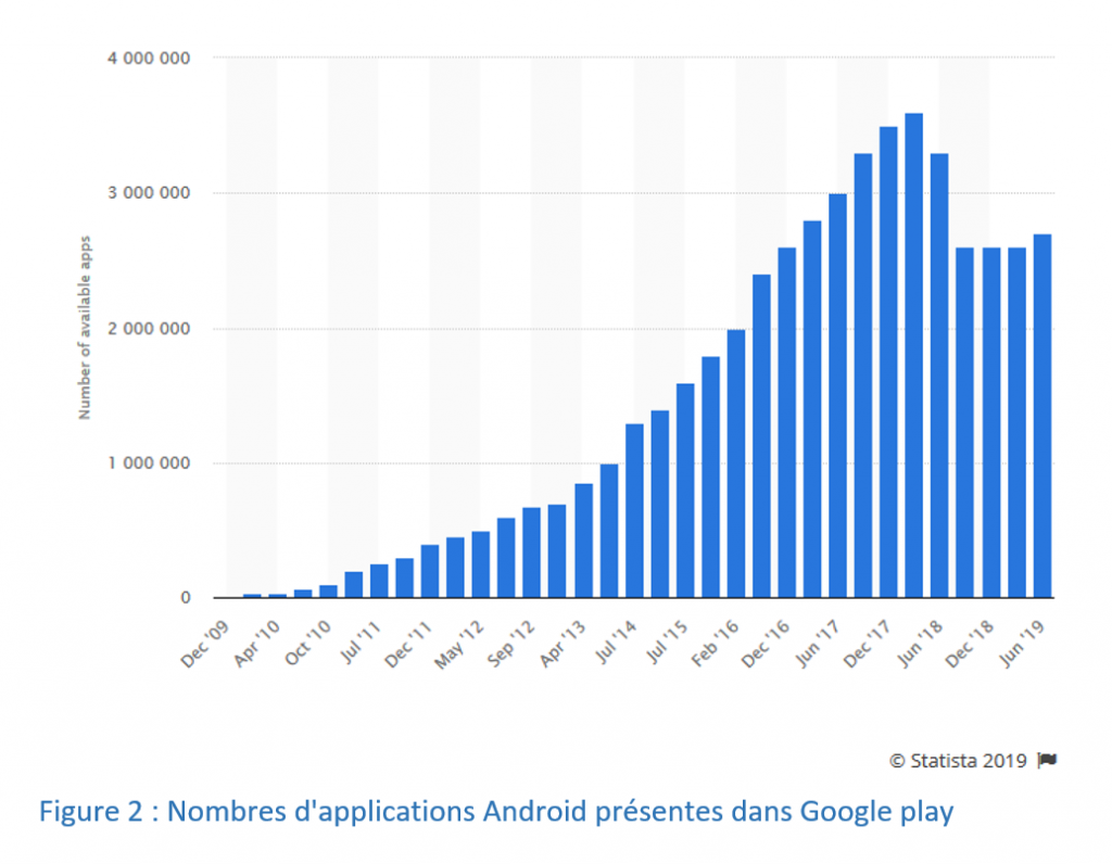 Le nombre de sites web ne prend pas compte des applications mobile,s qui dépassent les 2 millions d’applications. On peut apercevoir dans la figure 2, le nombre d’applications Android disponibles sur Google Play.
