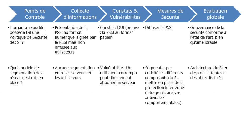 En d’autres termes, une Activité d’Audit de Sécurité vise à Collecter des Informations & des Preuves par rapport à des Points de Contrôle (ou un Référentiel d’Exigences) préalablement défini, et à évaluer ces Informations pour formaliser des Constats et identifier des Vulnérabilités sur le SI. En guise de conclusions, des Recommandations peuvent être proposées (sous forme de mesures correctives ou amélioratives), ainsi qu’une Evaluation globale du Niveau de Sécurité. Le tout, de manière parfaitement rigoureuse, méthodique, documentée, et tracée.