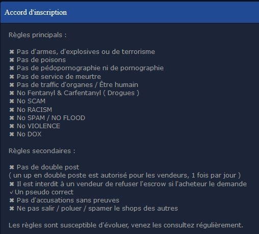 Il y a cependant quelques règles à respecter et vous serez rapidement banni au moindre manquement à ces dites règles. Si vous ne savez pas chiffrer vos e-mails par exemple, personne ne traitera avec vous. Je vous montre pour l’exemple, le règlement d’un darkweb market francophone (fautes comprises).